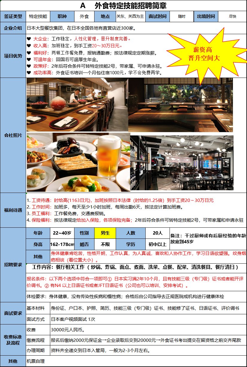 報(bào)名→日方面試1次→培訓(xùn)外食特定→參加考試→辦理在留→下簽赴日工作