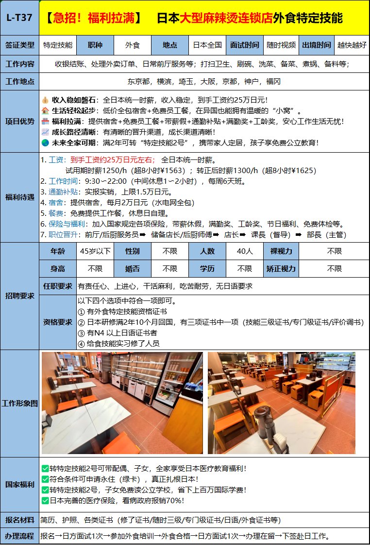 主要負(fù)責(zé)前廳服務(wù)和后廚幫廚(煮面,洗菜、配菜、清洗餐具)。免費(fèi)提供工作餐,有獎金,有漲薪機(jī)會?;貒罂赏撕裆杲稹7蠗l件者干滿2年后可轉(zhuǎn)特定技能2號,可帶家屬,可申請永住。