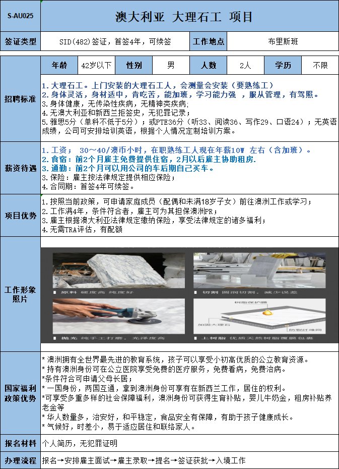 實力公司,主營家居建材,主要負責鋪設瓷磚、地板,1年以上相關工作經(jīng)驗;年薪73150澳幣,多勞多得,工資漲薪潛力極大