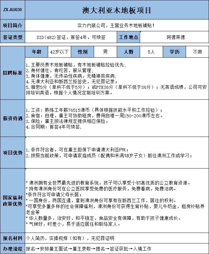 主要負責木地板鋪貼,有木地板鋪貼經驗優(yōu)先。熟練工年薪76515澳幣(具體根據技能水平和工作經驗)