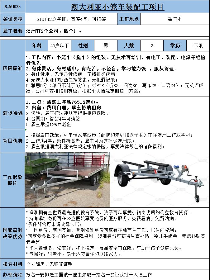 小籠車(拖車)的組裝。無技術(shù)可培訓(xùn),有電工,裝配,電焊等經(jīng)驗者優(yōu)先;熟練工年薪76515澳幣。