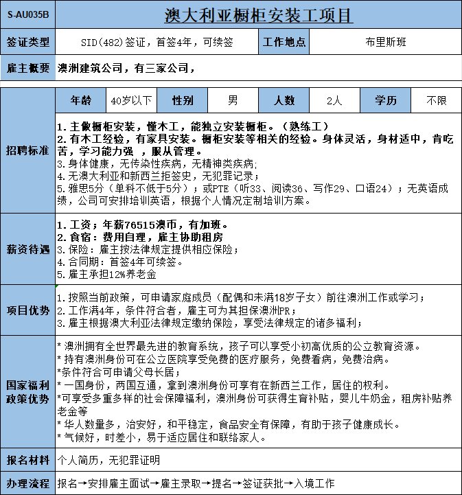 實(shí)力公司,主營(yíng)家居建材,主要負(fù)責(zé)鋪設(shè)瓷磚、地板,1年以上相關(guān)工作經(jīng)驗(yàn);年薪73150澳幣,多勞多得,工資漲薪潛力極大
