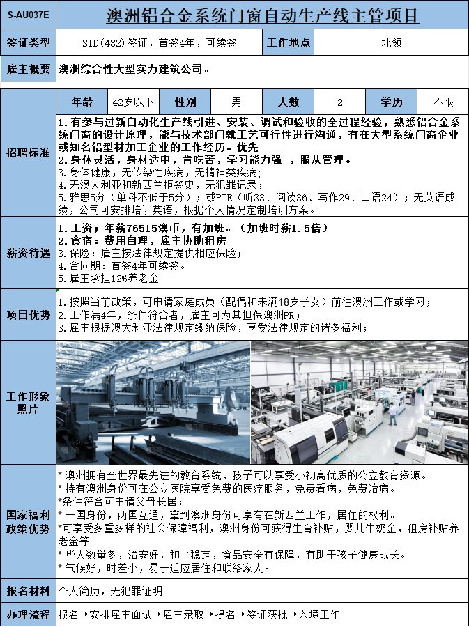 安裝鋁合金門窗,1年以上相關(guān)工作經(jīng)驗;年薪73150澳幣。