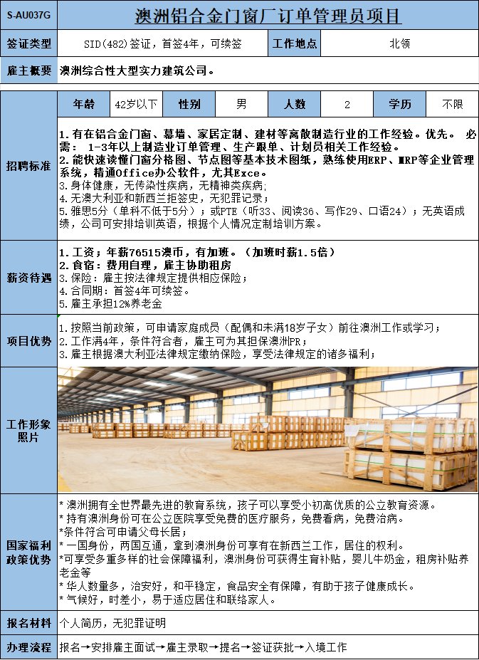 ? 現成名額,申請快,歡迎有成績的朋友 ? 全澳多家倉庫,雇主實力可靠 ? 無需技術背景,有體力勞動經驗、能吃苦即可 ? 無相關經驗可安排國內企業(yè)實習 ? 雇主支持女士作為主申請人,夫妻一起