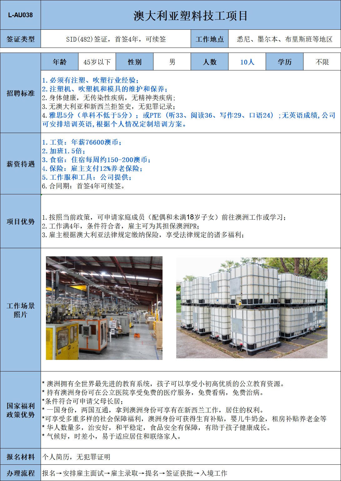 噴涂工,有相關(guān)工作經(jīng)驗(yàn)者優(yōu)先,無經(jīng)驗(yàn)者也可;熟練工年薪76515澳幣;雇主支付12%養(yǎng)老保險.