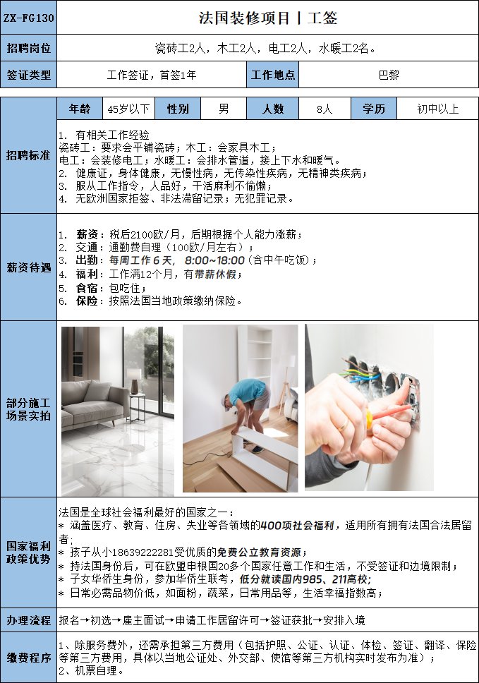 赴法國(guó)(巴黎)- 瓷磚工/木工/電工/水暖工