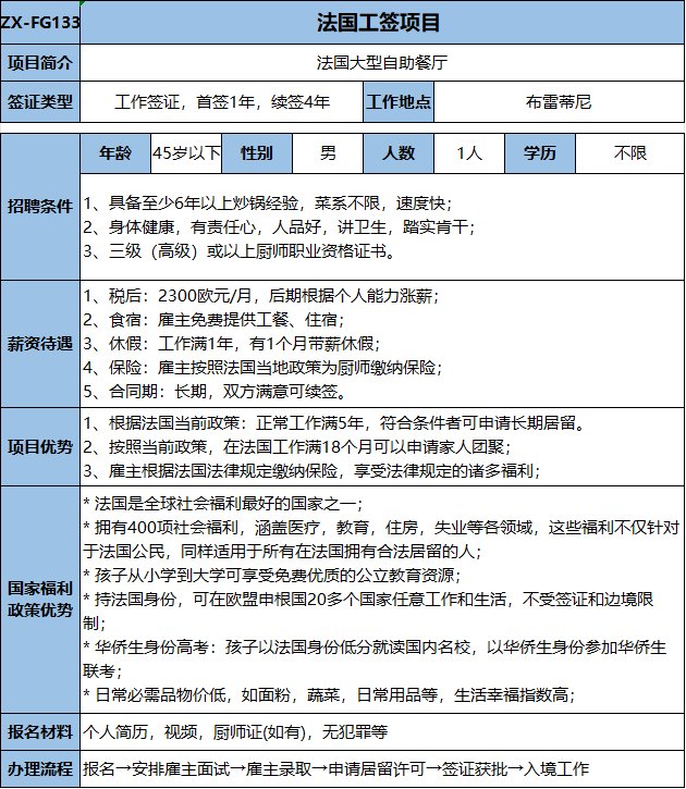 有后廚經(jīng)驗或有相關餐飲經(jīng)驗優(yōu)先,不會者可培訓;包吃住,稅后:1900歐元/月,后期根據(jù)個人情況漲薪。