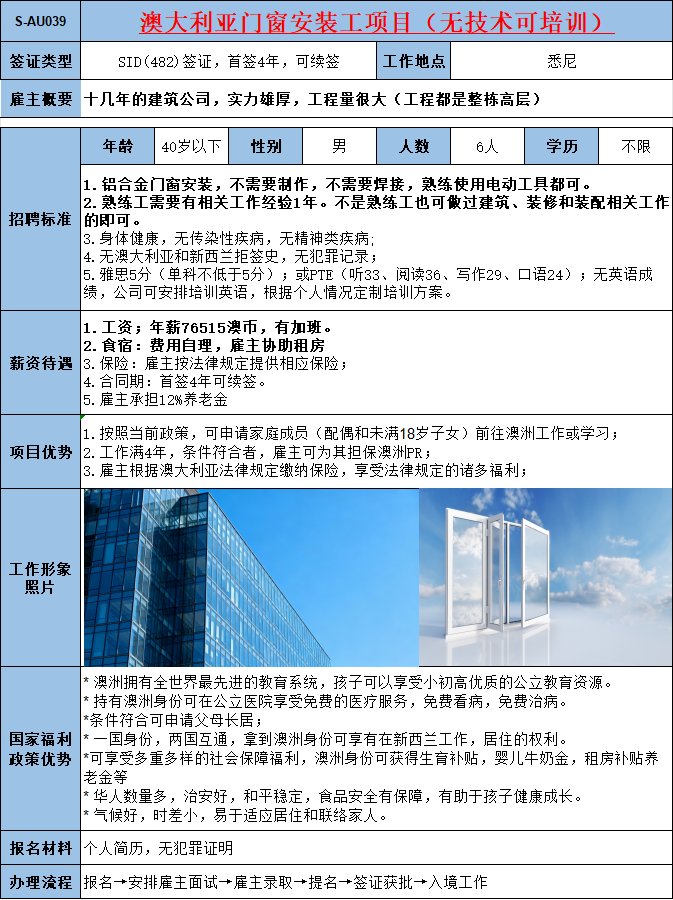 安裝鋁合金門窗,1年以上相關(guān)工作經(jīng)驗(yàn);年薪73150澳幣。
