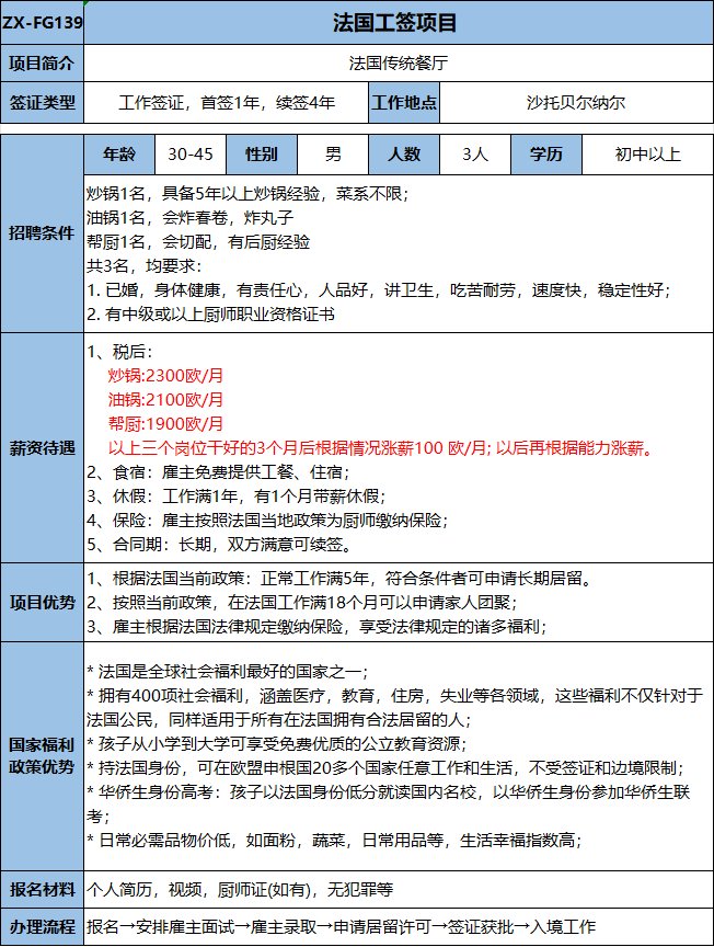 5年以上炒鍋經(jīng)驗(yàn),菜系無要求;包吃住,稅后:2400~2500歐