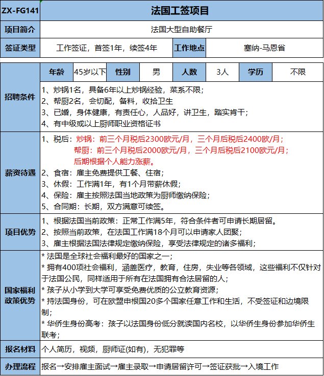炒鍋1名,具備6年以上炒鍋經(jīng)驗(yàn),菜系不限;幫廚2名,會(huì)切配,備料,收拾衛(wèi)生;炒鍋:前三個(gè)月稅后2300歐元/月,三個(gè)月后稅后2400歐/月;幫廚:前三個(gè)月稅后2000歐元/月,三個(gè)月后稅后2100歐元/月;后期根據(jù)個(gè)人能力漲薪。