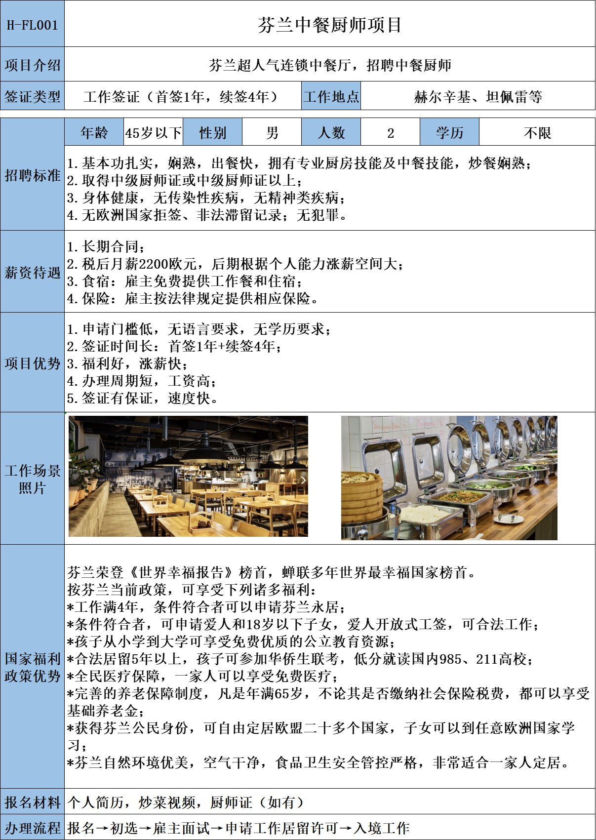 芬蘭中餐廚師,薪資高福利好,廚師50歲以下均可,包吃包住稅后2200歐,可移民,老板年輕大方,后期漲薪快幅度大。