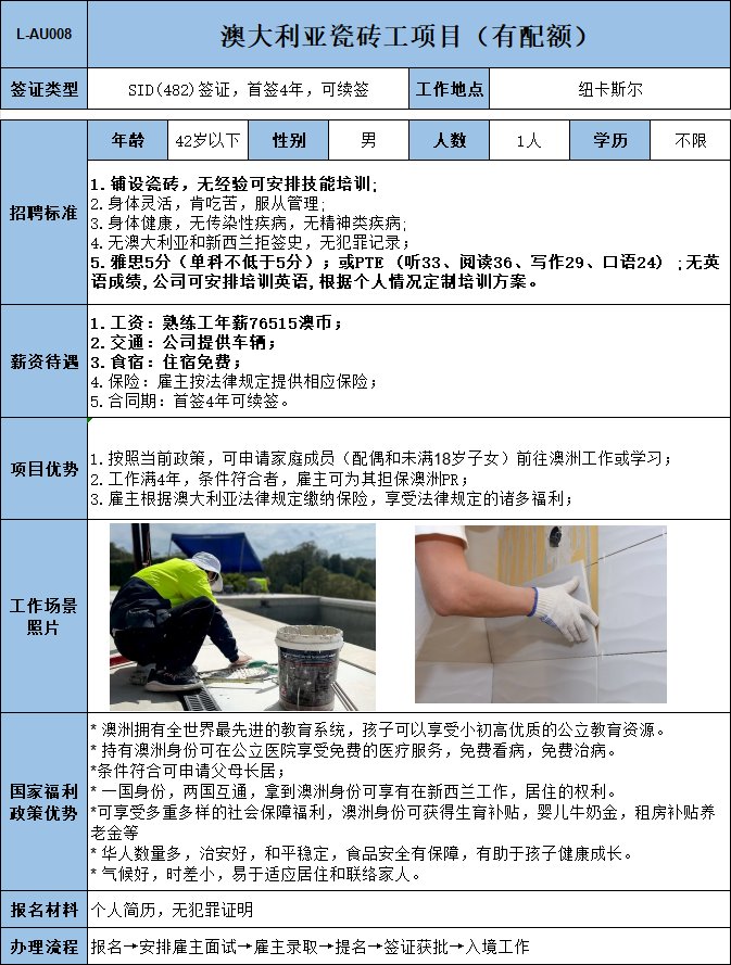 實力公司,主營家居建材,主要負責鋪設瓷磚、地板,1年以上相關工作經(jīng)驗;年薪73150澳幣,多勞多得,工資漲薪潛力極大