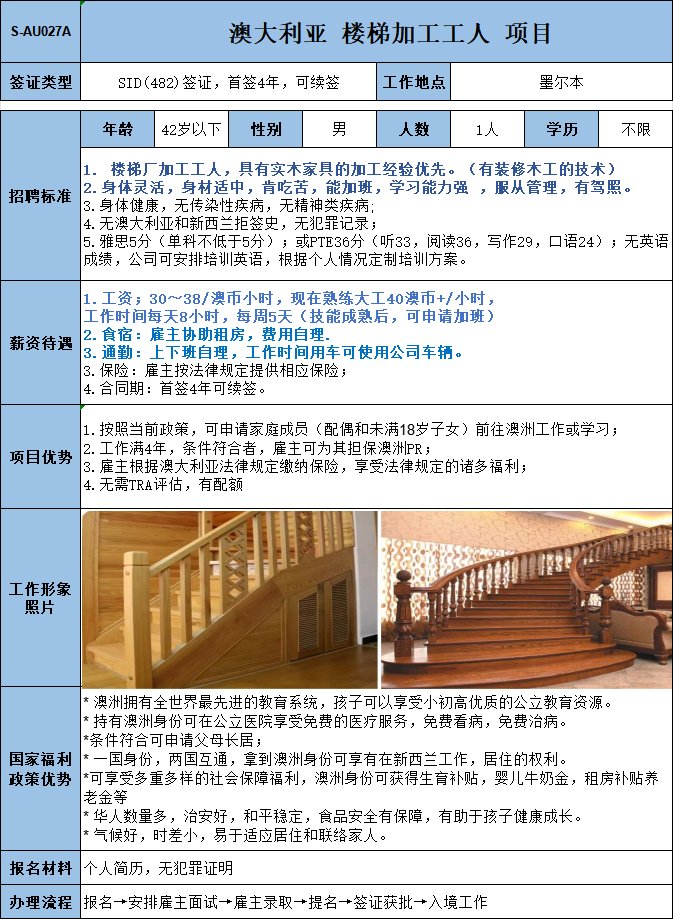 赴澳大利亞(墨爾本)- 樓梯加工工人