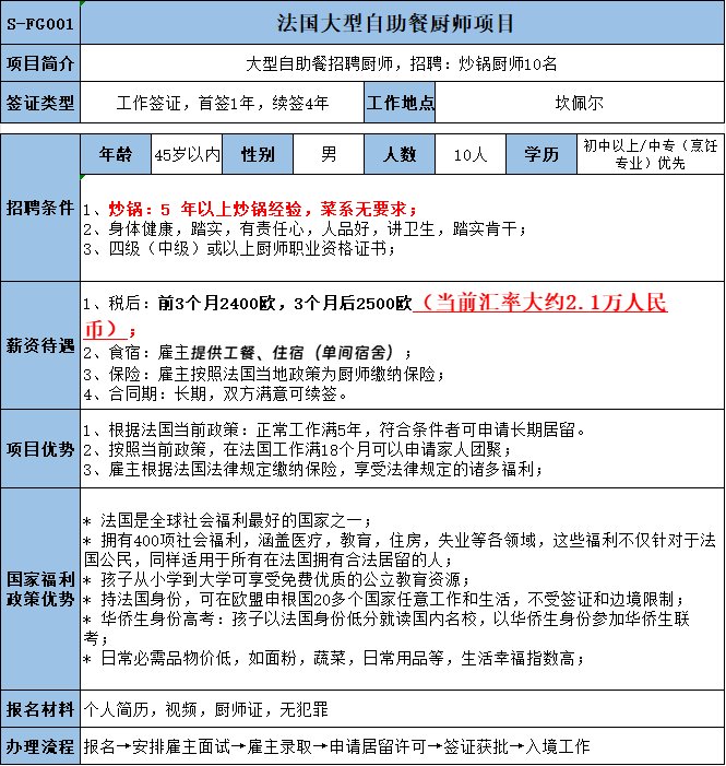 5年以上炒鍋經(jīng)驗(yàn),菜系無要求;包吃住,稅后:2400~2500歐
