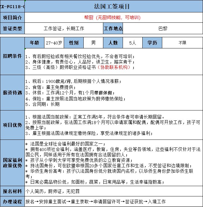 有后廚經(jīng)驗(yàn)或有相關(guān)餐飲經(jīng)驗(yàn)優(yōu)先,不會(huì)者可培訓(xùn);包吃住,稅后:1900歐元/月,后期根據(jù)個(gè)人情況漲薪。