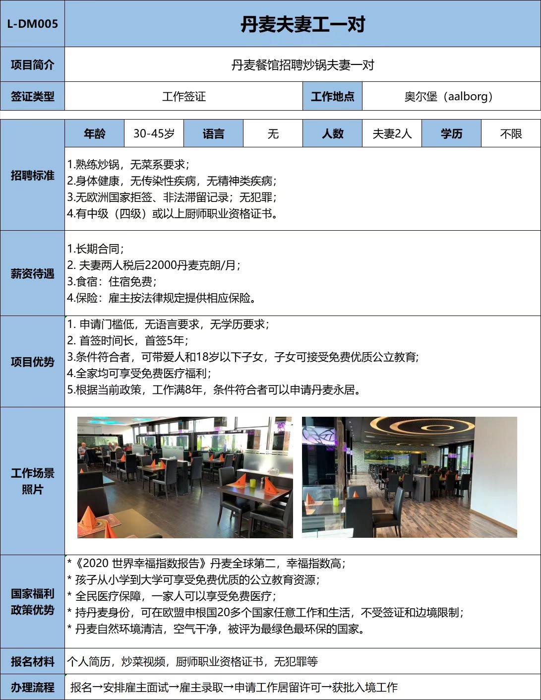 丹麥超高薪夫妻項(xiàng)目來(lái)咯!28000丹麥克朗包吃住,餐廳規(guī)模大,值得信賴。目前需要兩對(duì)夫妻,若單人申請(qǐng)也可考慮。