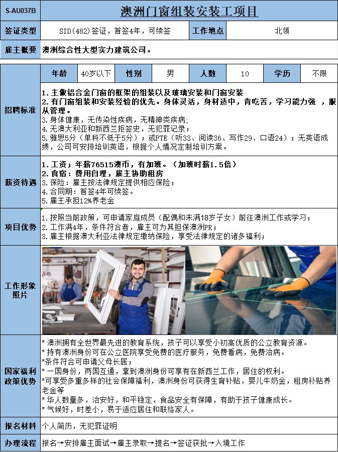 赴澳大利亞(北領(lǐng))- 門窗組裝安裝工