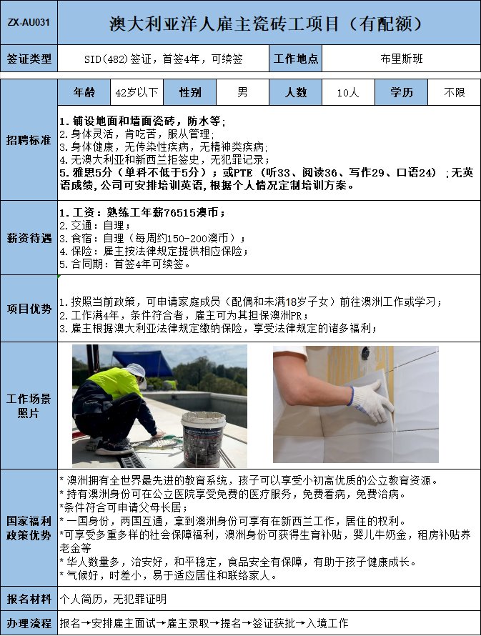 實力內(nèi)裝公司,主營業(yè)務(wù)瓷磚鋪貼,已獲雇主擔(dān)保資格!年薪73150澳幣,多勞多得,工資漲薪潛力極大