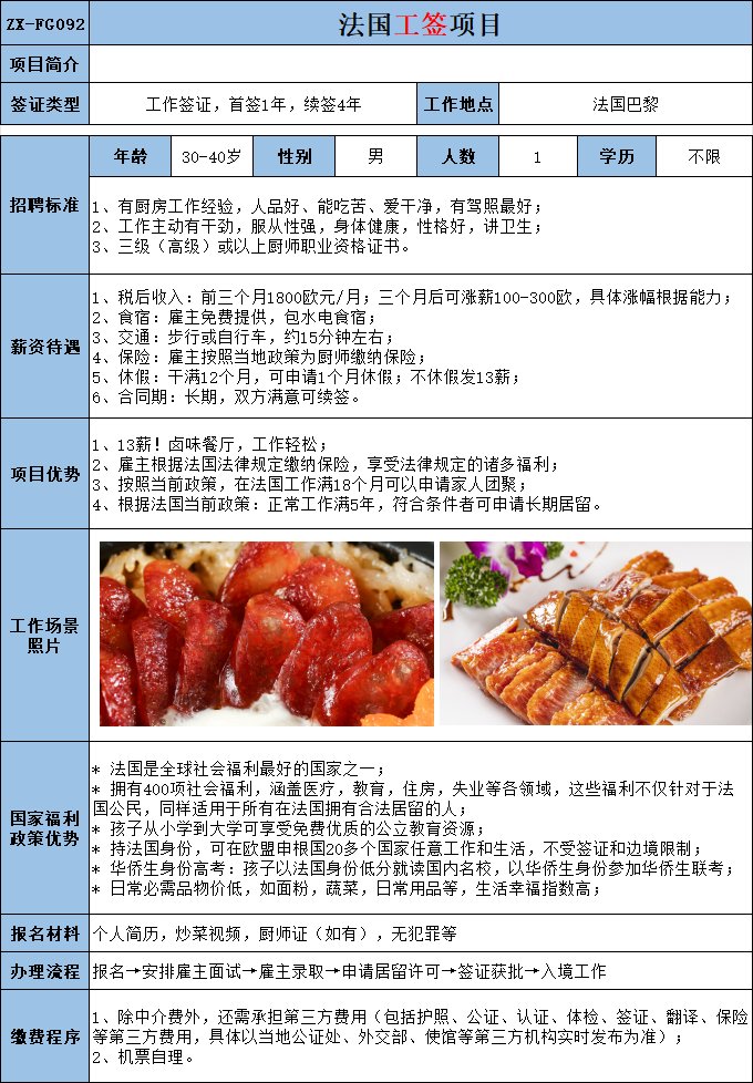 具備后廚經(jīng)驗,會切配、油鍋,負(fù)責(zé)后廚切配、油鍋工作;稅后:2000歐元/月,后期根據(jù)個人能力漲薪.